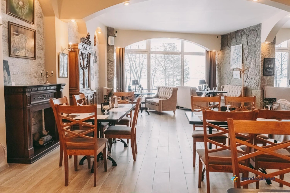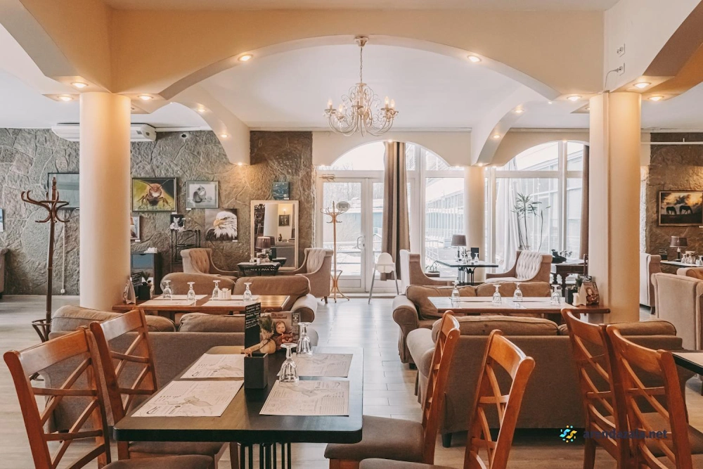 Основной зал ресторана "Корчма" Старая Мельница приглашает посетителей окунуться в атмосферу прекрасного места с красивой территорией, где вечером зажигается романтичное освещение. Здесь подают вкусные, свежие блюда в трех уютных ресторанах, а по выходным для детей организованы целый день развлечений и щедрые сытные завтраки с шампанским. Номера регулярно убираются и пополняются всем необходимым, однако стены довольно тонкие, а домики небольшие и обшарпанные, но это не мешает насладиться отдыхом или провести торжественное мероприятие в банкетном зале.
