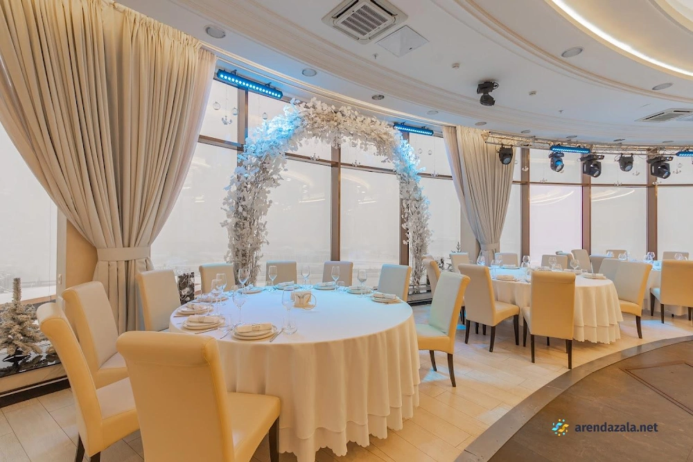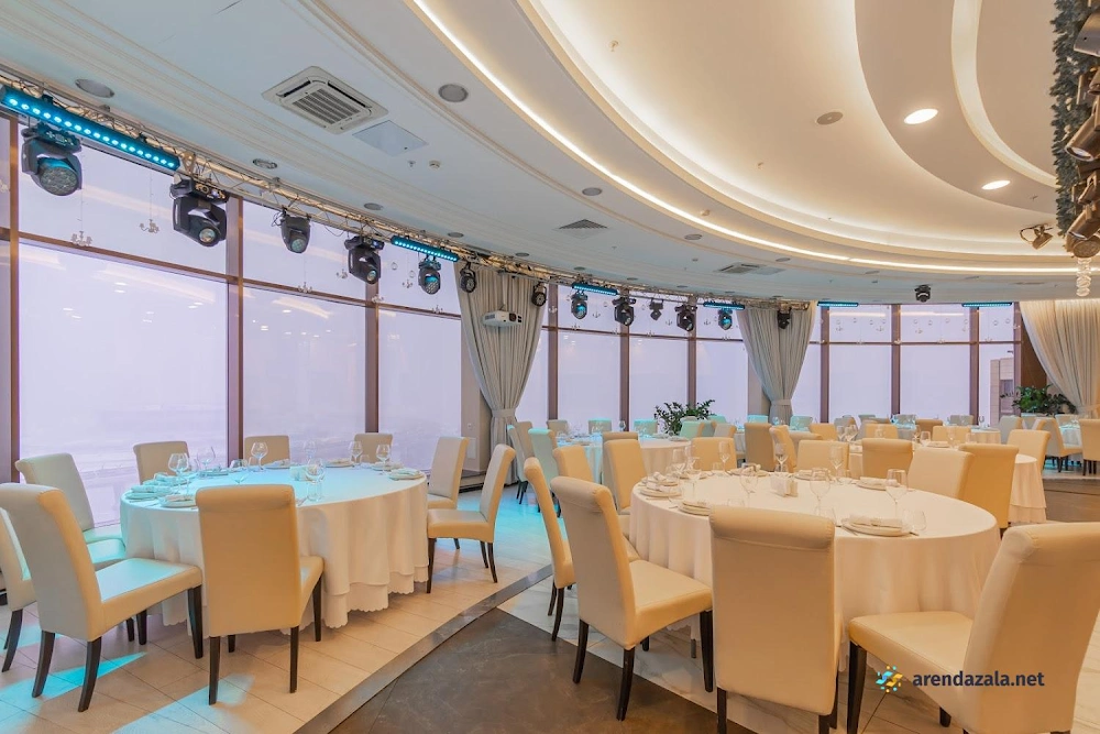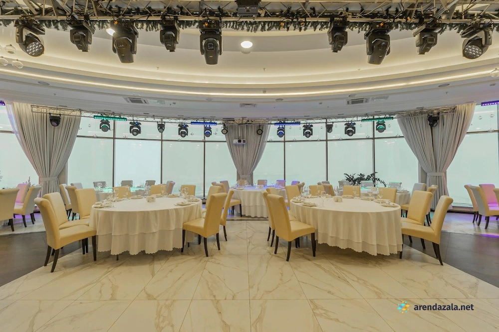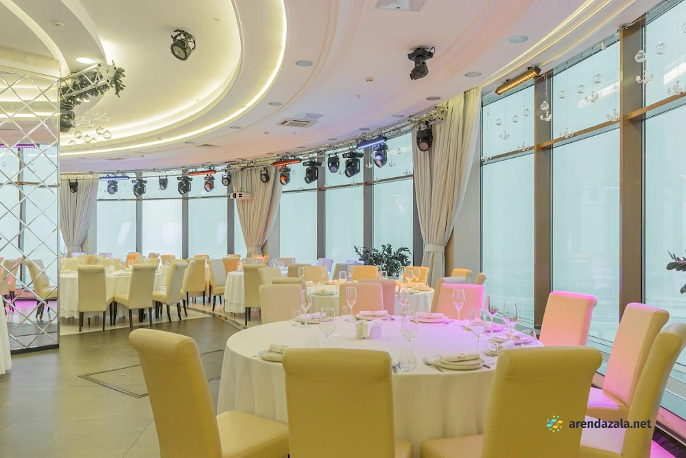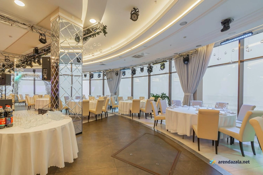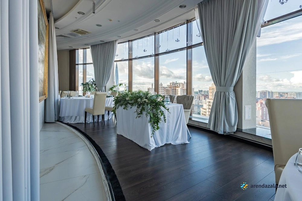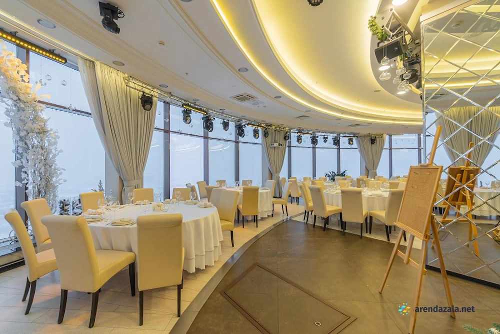 Основной зал представляет собой уникальное панорамное пространство на 24 этаже, которое вращается на 360 градусов, открывая потрясающий вид на Газпром Арену, Приморский район, ЦПКиО и Финский залив. Это идеальное место для проведения торжественных мероприятий, таких как свадьбы и корпоративы, где гости могут насладиться изысканной кухней, профессиональным обслуживанием и захватывающими видами из огромных окон. Интерьер отличается оригинальным дизайном, а высококлассная команда обеспечивает безупречную организацию любого праздника.