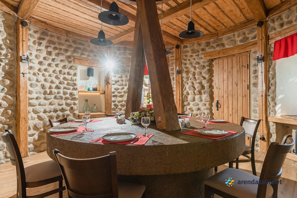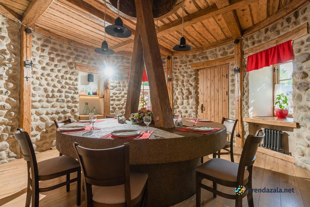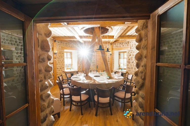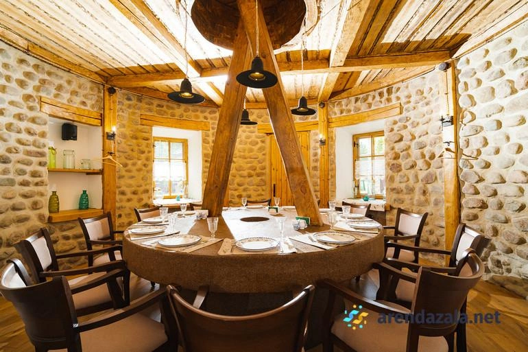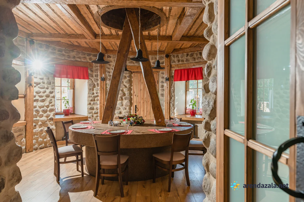 Основной зал ресторана "Корчма" Старая Мельница приглашает посетителей окунуться в атмосферу прекрасного места с красивой территорией, где вечером зажигается романтичное освещение. Здесь подают вкусные, свежие блюда в трех уютных ресторанах, а по выходным для детей организованы целый день развлечений и щедрые сытные завтраки с шампанским. Номера регулярно убираются и пополняются всем необходимым, однако стены довольно тонкие, а домики небольшие и обшарпанные, но это не мешает насладиться отдыхом или провести торжественное мероприятие в банкетном зале.
